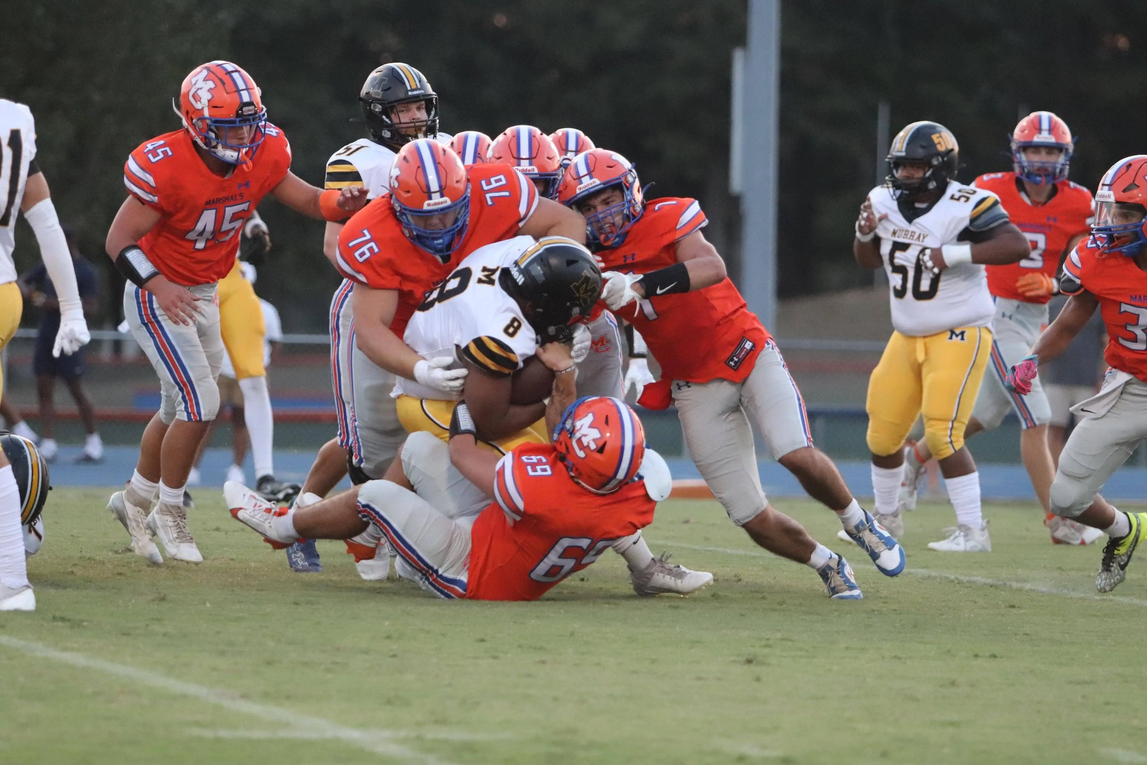 A great four quarters of effort by the Marshals fell short on Friday in a 34-19 loss to a talented Murray High team, one of the top Class 2A teams in the state. The Marshals never quit in their pursuit of putting points on the board despite big plays by the Tigers and a couple of offensive drives that fell just short of finding the endzone.