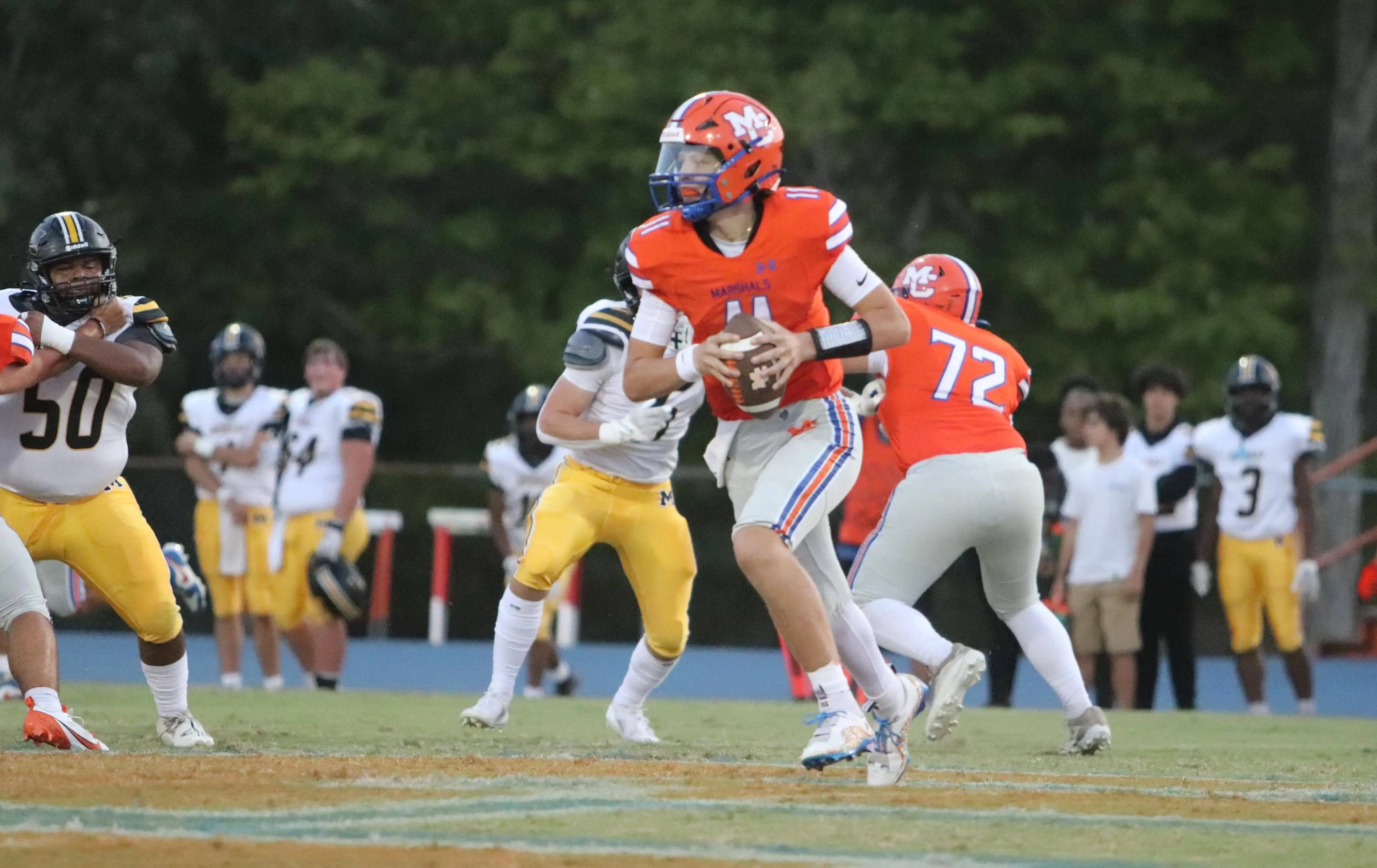 Jezik was 18 of 28 in passing for 208 yards. Leading receivers were Robinson with four receptions for 79 yards and Henson with eight receptions for 75 yards. The Marshals had 150 rushing yards, led by Tomasson with 83 yards on 22 carries and Luke Webber with 49 yards on 12 carries. Leading in tackles was Kolt Lindsey with eight and Noah Short had six.