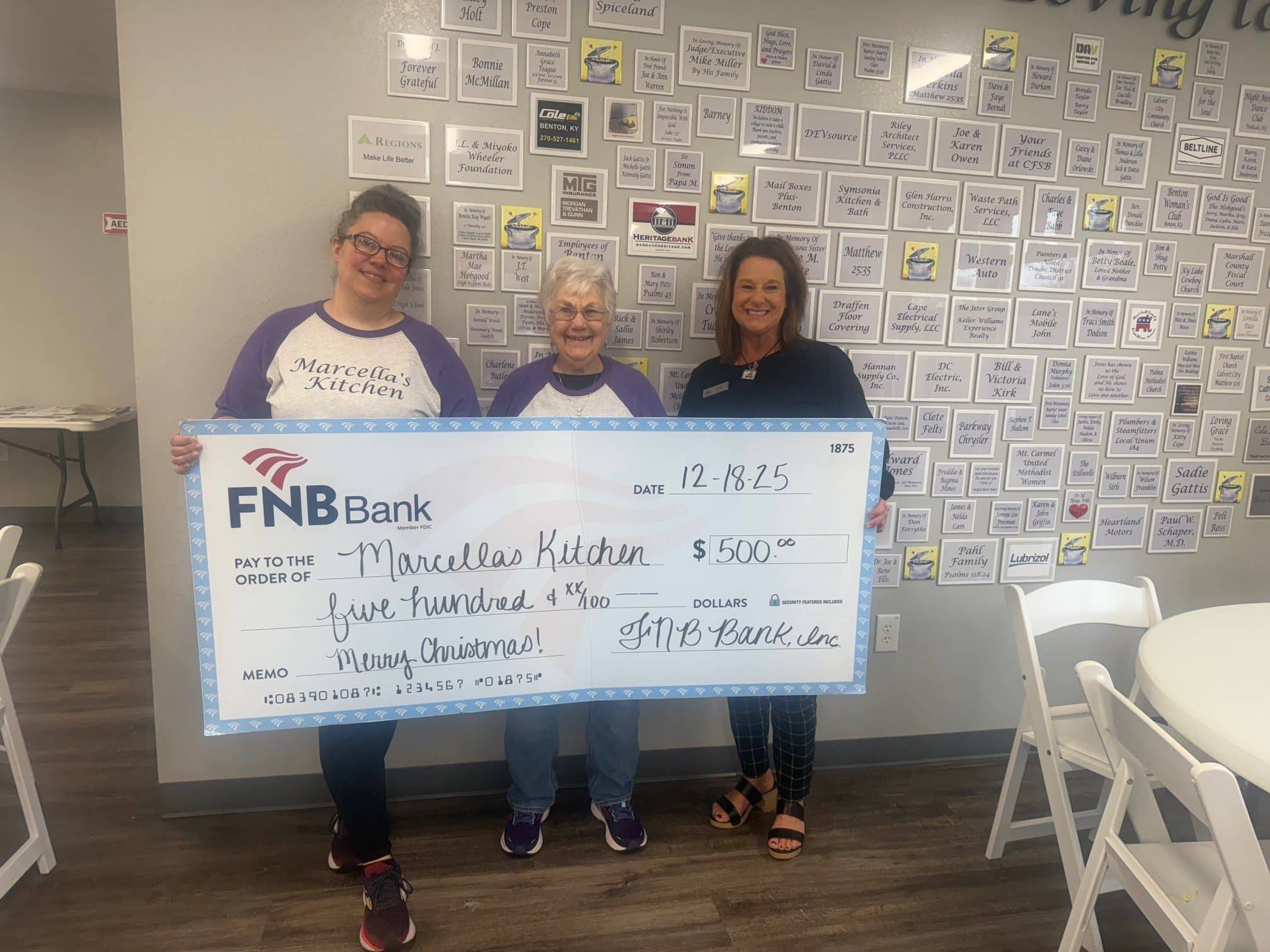(MAYFIELD, Ky.) — FNB Bank announced Tuesday it has donated $1,000 to support two Marshall County charitable organizations during the holiday season, with each receiving $500 to help serve residents in need.