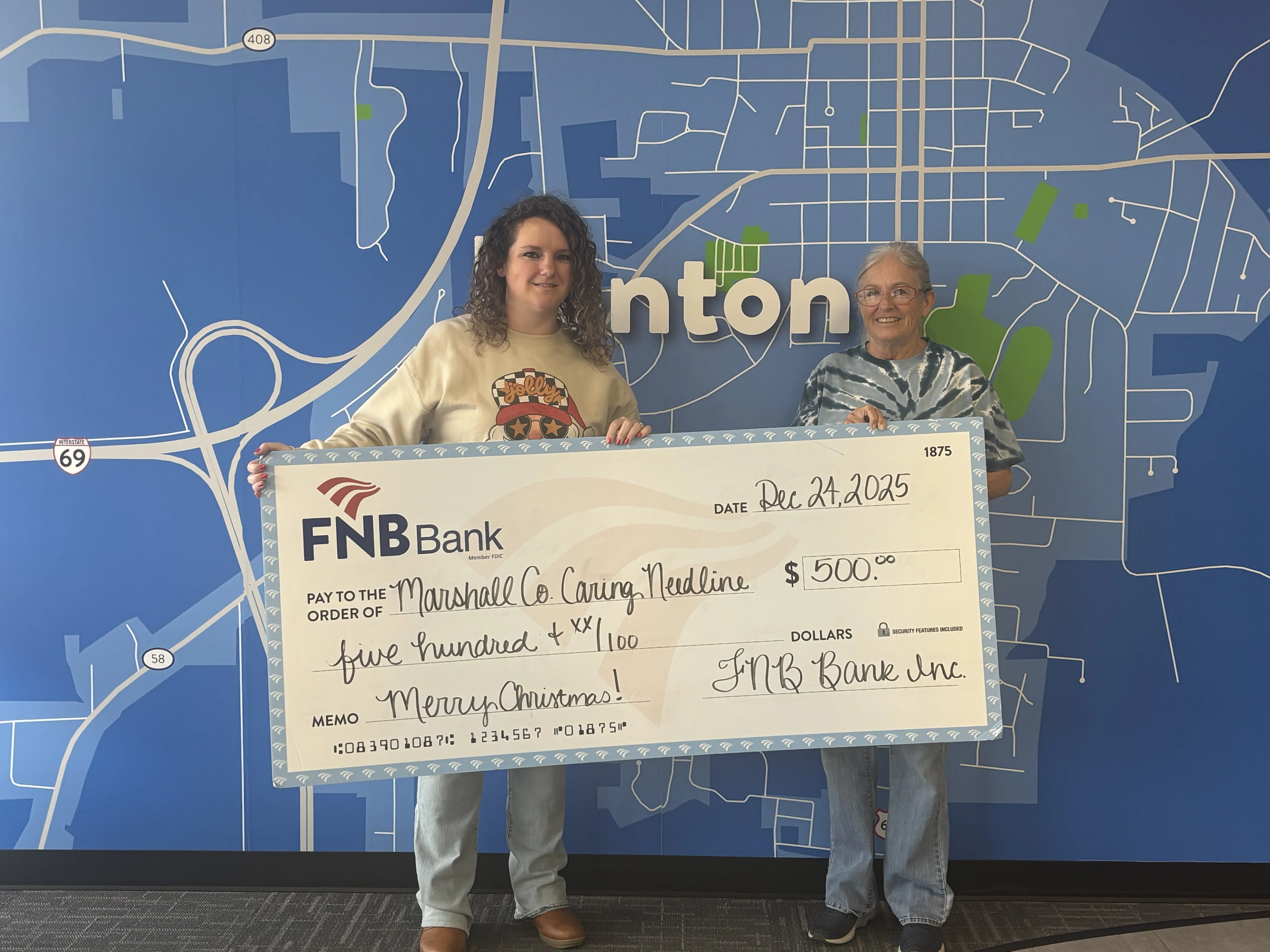 “FNB is excited to support these two great organizations with this Christmas donation,” said Trent Lovett, Marshall County Market President. “Marshall County Caring Needline and Marcella’s Kitchen are wonderful programs that provide tremendous assistance to those within our community, and we hope these donations will assist in furthering their missions this Christmas.”